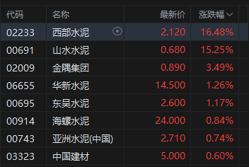 建材水泥股多股大涨,西部水泥涨超16%。西部水泥发盈喜,预料截至今年6月底止半年公司拥有人应占溢利同比上升80%至1倍;去年同期溢利约3.87亿元。公司表示,上半年盈利增加,主要因为期内海外水泥收益大增;平均售价增加及销售成本减少,中国的水泥销售毛利增加约48%;集团因销售物业而录得溢利约9770万元,而去年同期没有相关溢利;就商誉及其他非流动资产确认减值亏损拨回约1.15亿元,而去年并无录得有关拨回。