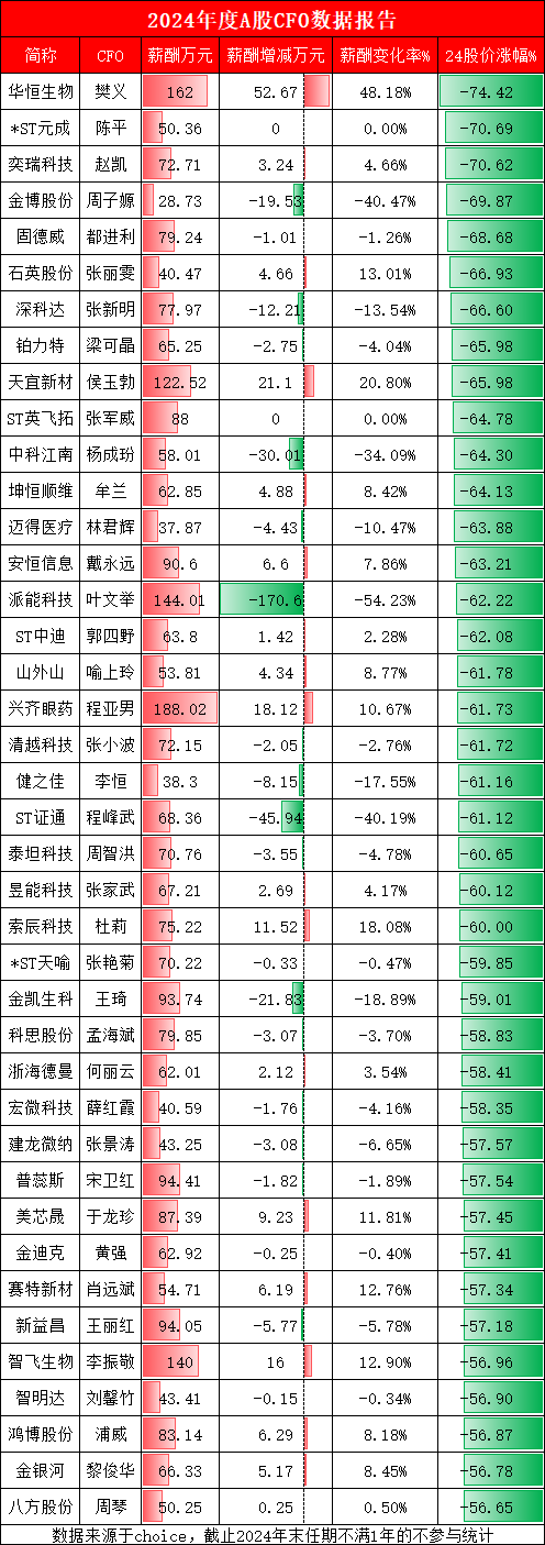 2024年度A股CFO数据报告:兴齐眼药股价暴跌61.73%,财务总监程亚男薪酬涨10.67%