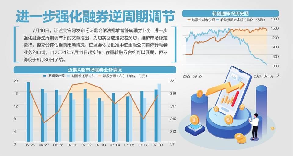 7月10日,证监会官网发布消息称,依法批准中证金融公司暂停转融券业务的申请,自2024年7月11日起实施。存量转融券合约可以展期,但不得晚于9月30日了结。同时,批准证券交易所将融券保证金比例由不得低于80%上调至100%,私募证券投资基金参与融券的保证金比例由不得低于100%上调至120%,自2024年7月22日起实施。