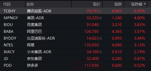 中概科技龙头股中,腾讯控股ADR涨近7%,美团ADR涨4%,阿里巴巴、网易、百度集团等涨超3%。