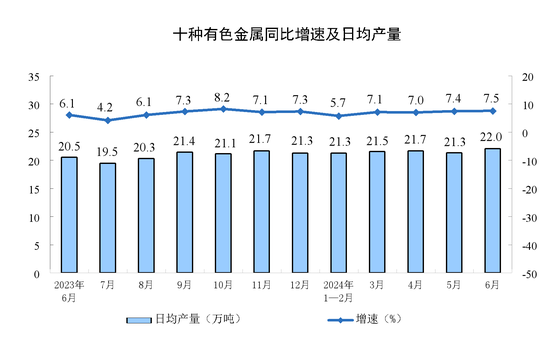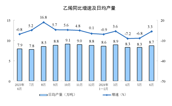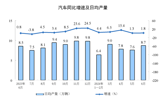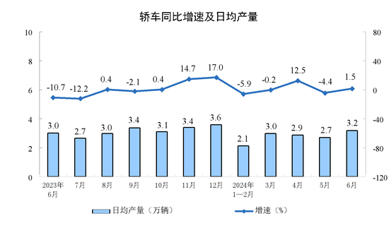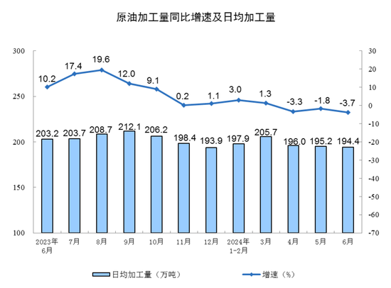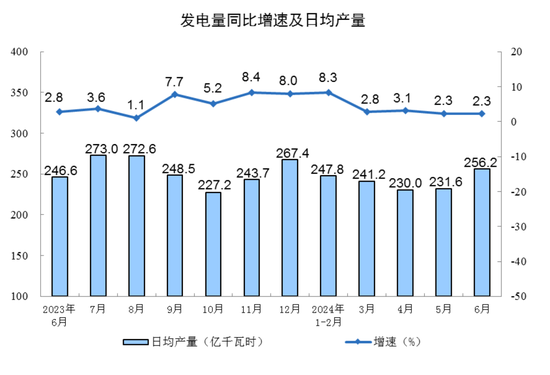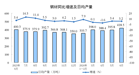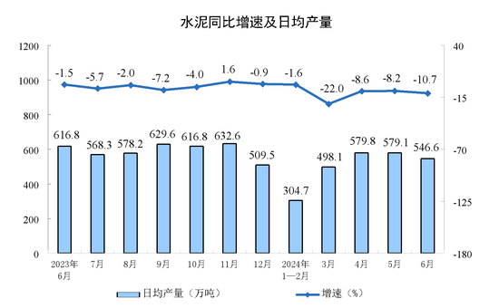 分产品看,6月份,规模以上工业619种产品中有369种产品产量同比增长。其中,钢材12555万吨,同比增长3.2%;水泥16397万吨,下降10.7%;十种有色金属661万吨,增长7.5%;乙烯261万吨,增长3.3%;汽车261.3万辆,增长1.8%,其中新能源汽车102.5万辆,增长37.0%;发电量7685亿千瓦时,增长2.3%;原油加工量5832万吨,下降3.7%。
