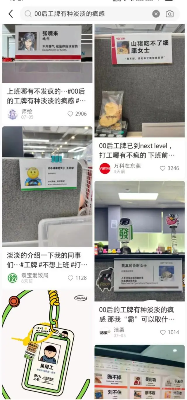 最近,“00后疯感工牌”成为了社交媒体上的热门话题。这些工牌以其独特的创意和表达方式吸引了广泛关注。工牌上常见的元素包括谐音梗、MBTI解构(一种人格类型理论模型)和猫meme等,用以反映工作心境和态度。例如,有的工牌上写着“陈住气”或“张工资”,还有的通过反讽或戏谑的方式表达自己的心情,如“在做了在做了,真的在做了”或“已经懒得沟通了,你说晚上有太阳我都认了”。