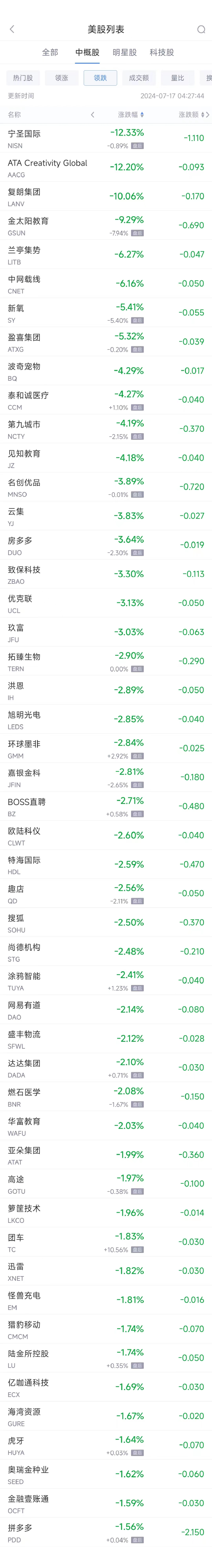 下跌股当中(按市值降序排列),拼多多跌1.56%,网易跌0.82%,携程跌0.44%,新东方跌0.71%,满帮跌1.23%,BOSS直聘跌2.71%,唯品会跌0.07%,名创优品跌3.89%,爱奇艺跌1.06%,慧荣科技跌0.23%,亚朵集团跌1.99%。