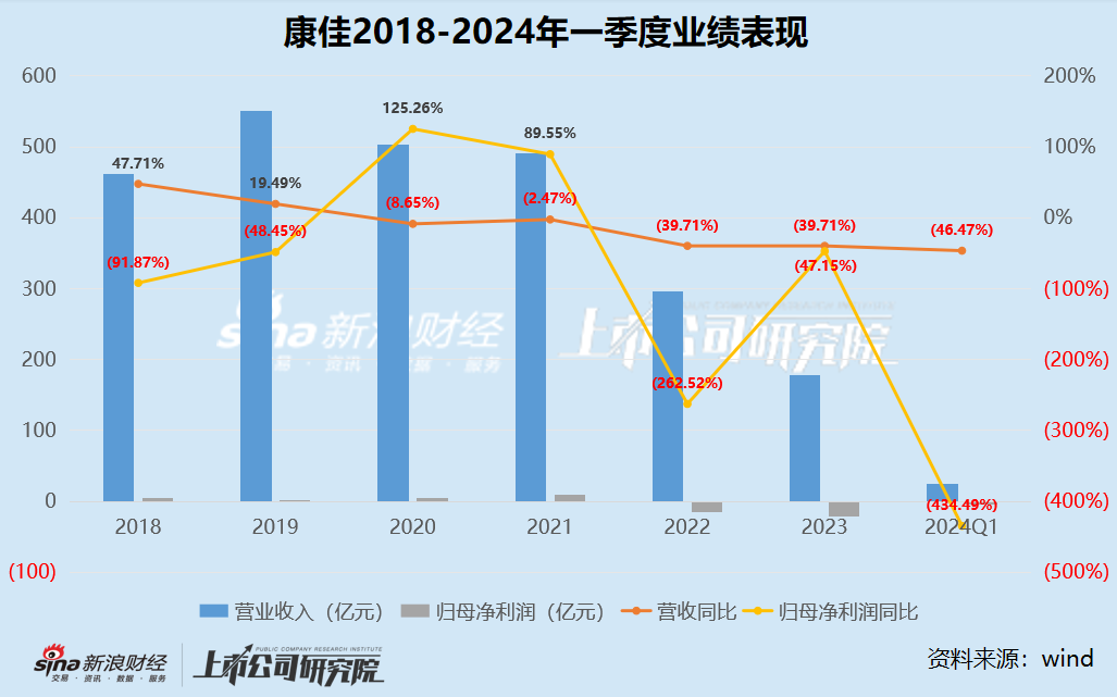 收入规模持续下滑,康佳的盈利能力表现也不容乐观。2021年及之前,康佳还能实现正向盈利,其中2020-2021年归母净利润还分别同比增长125.26%、89.55%。但2022年以来,康佳便由盈转亏,2022-2024年一季度归母净亏损分别为14.71亿元、21.64亿元、5.10亿元。