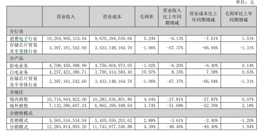 从公司2023年财报中披露的分业务数据来看,2023年康佳调整了业务结构及相关披露口径,将以往的消费电子、工贸、环保、半导体等业务分类调整为消费电子行业、存储芯片贸易及半导体行业两类。工贸业务中存储芯片加工贸易调整至存储芯片贸易及半导体业务,其他部分并入其他。