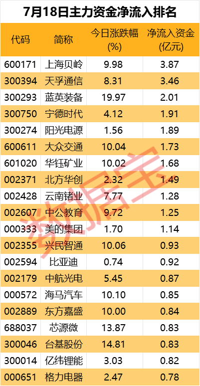 11只个股主力资金净流入超过1亿元。其中,上海贝岭(600171)、天孚通信(300394)、蓝英装备(300293)净流入额排名前三,依次为3.87亿元、3.46亿元、2.01亿元。