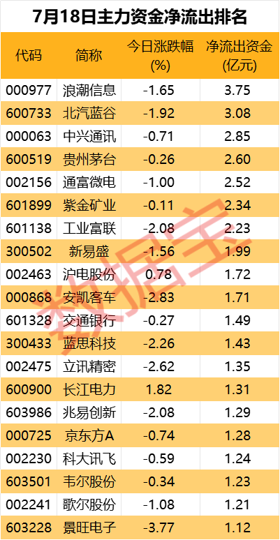 主力资金流出个股中,有25股主力资金净流出额高于1亿元。浪潮信息(000977)、北汽蓝谷(600733)净流出额超出3亿元;中兴通讯、贵州茅台(600519)、通富微电(002156)、紫金矿业、工业富联(601138)净流出额在2亿元以上。