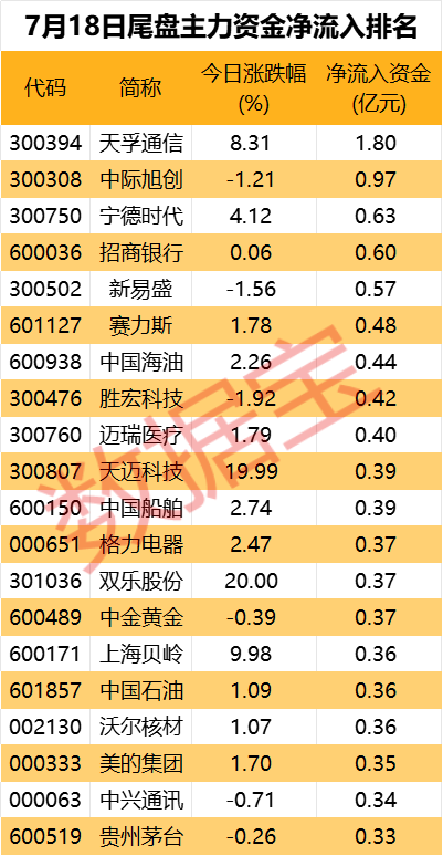 个股方面,光模块“三巨头”尾盘获得主力资金净流入,天孚通信、中际旭创(300308)、新易盛(300502)尾盘净流入额依次为1.8亿元、0.97亿元、0.57亿元;宁德时代(300750)、招商银行尾盘净流入额度超过6000万元。