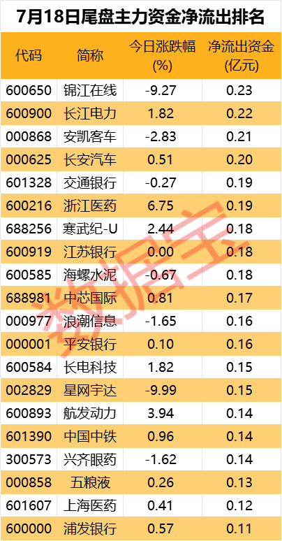 个股尾盘净流出额相对较低,锦江在线、长江电力(600900)、安凯客车等3股尾盘净流出额超过2000万元。