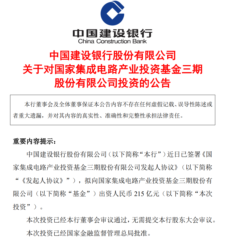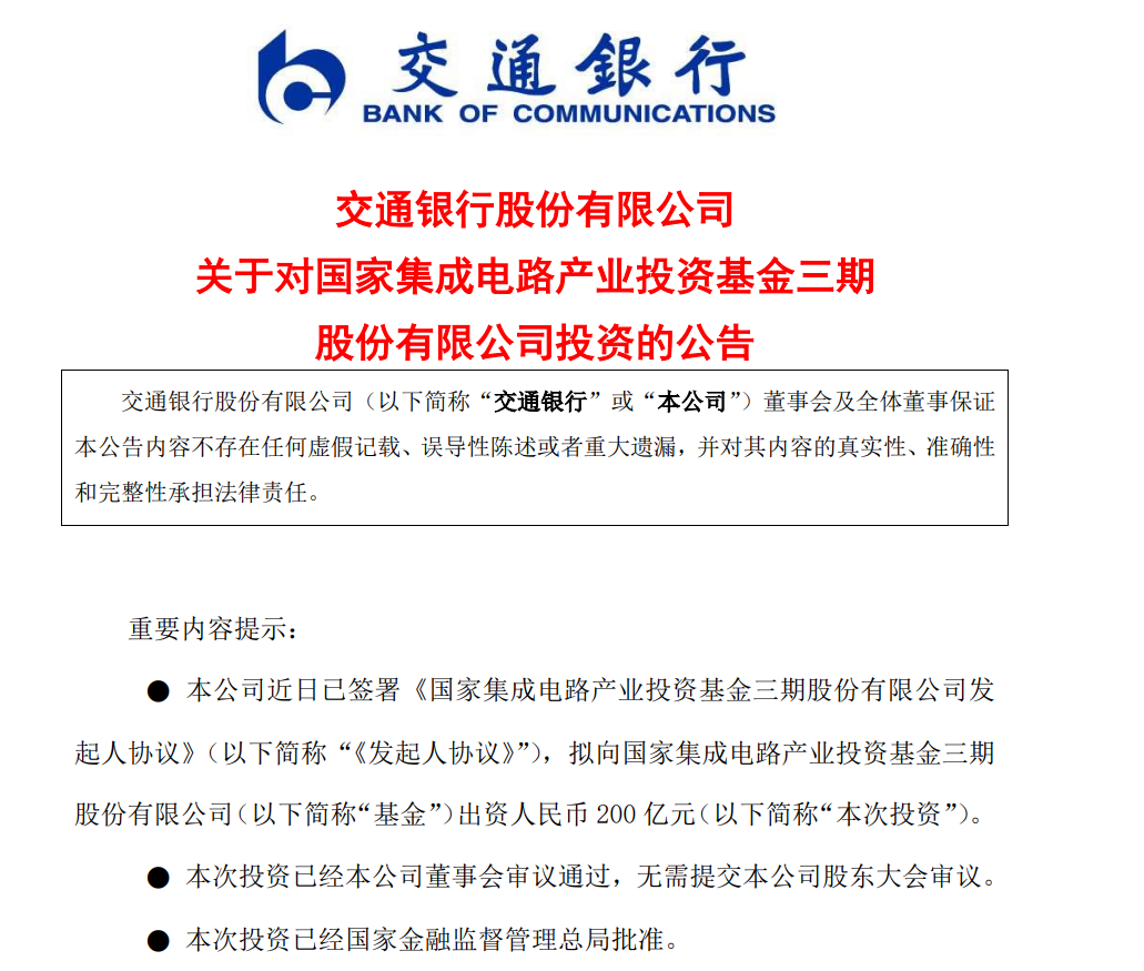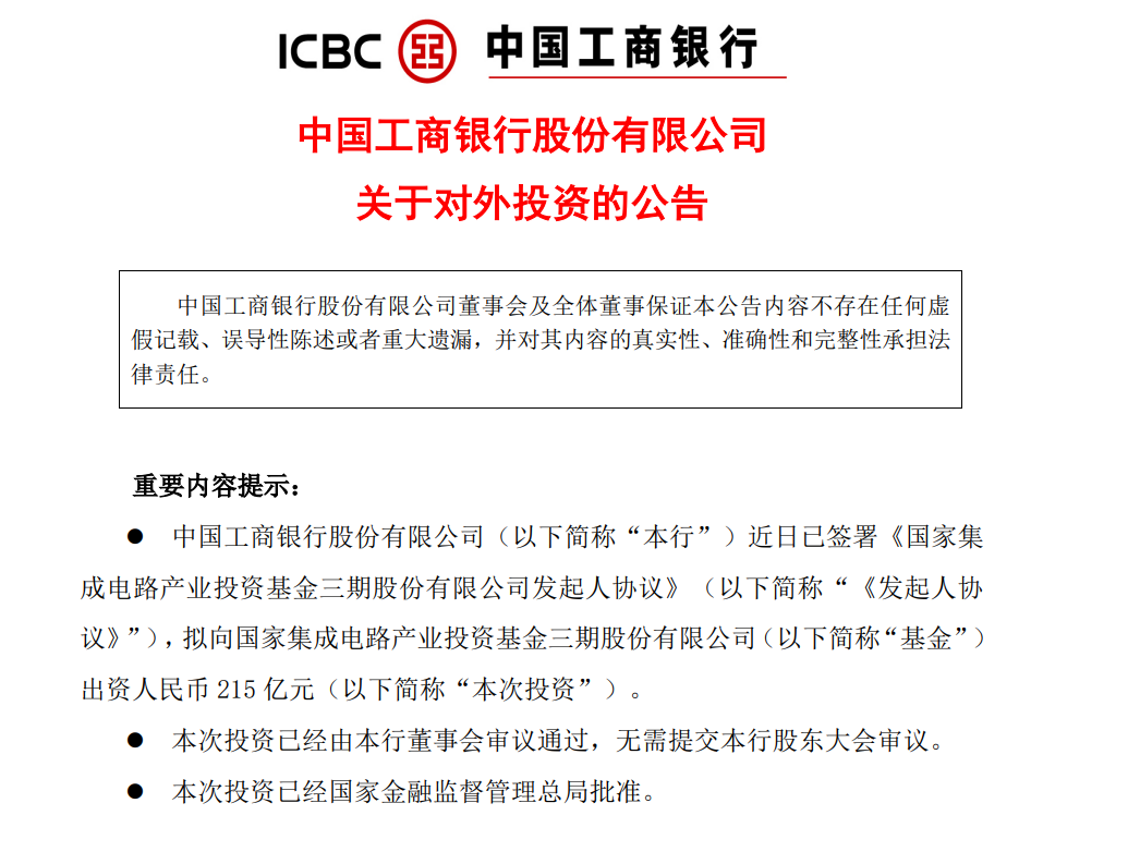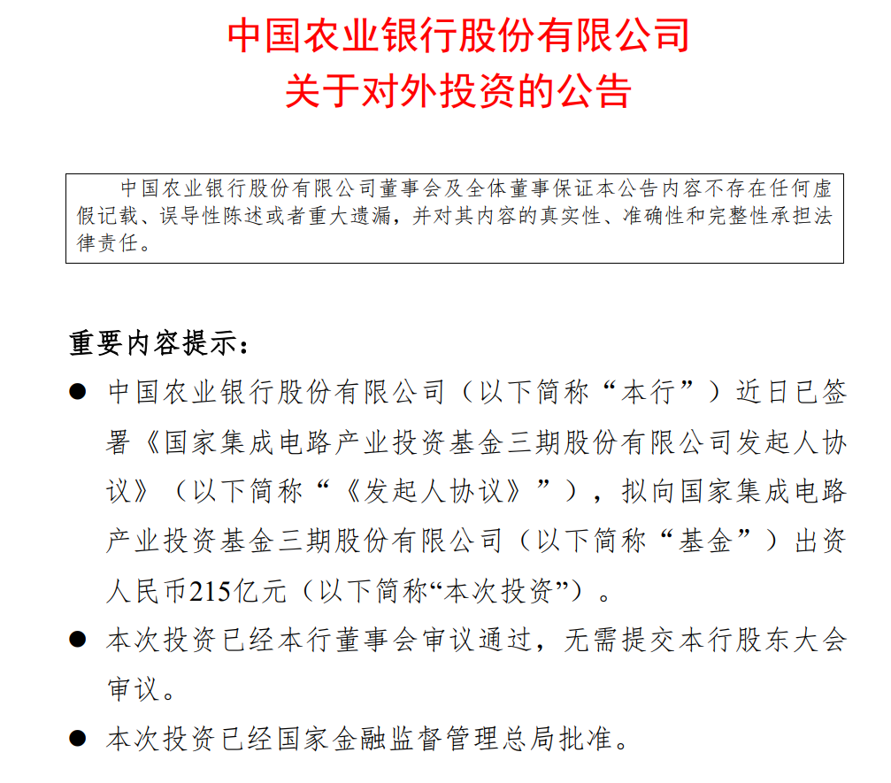 根据工商银行、农业银行、建设银行、中国银行、交通银行、邮储银行发布的公告,近日已签署《国家集成电路产业投资基金三期股份有限公司发起人协议》,拟向国家集成电路产业投资基金三期出资215亿元、215亿元、215亿元、215亿元、200亿元、80亿元,持股比例分别占6.25%、6.25%、6.25%、6.25%、5.81%、2.33%,预计自基金注册成立之日起10年内实缴到位。本次投资资金来源均为银行自有资金。