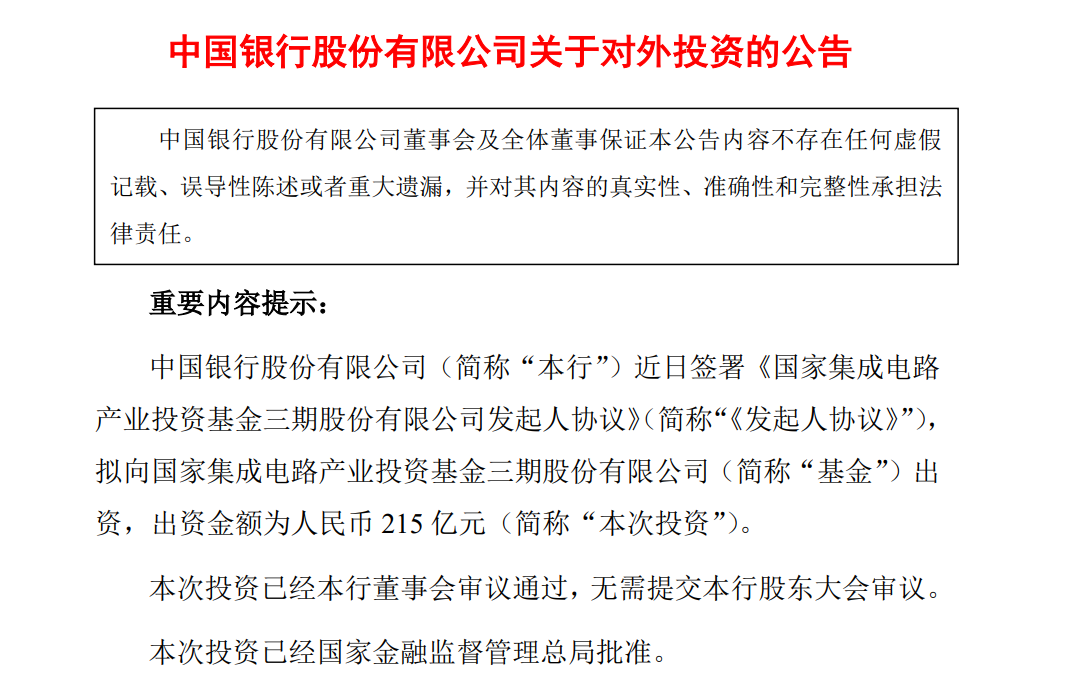 中国银行在公告中表示,旨在引导社会资本加大对集成电路产业的融资支持,重点投向集成电路全产业链。本次投资对公司金融业务发展具有重要意义。