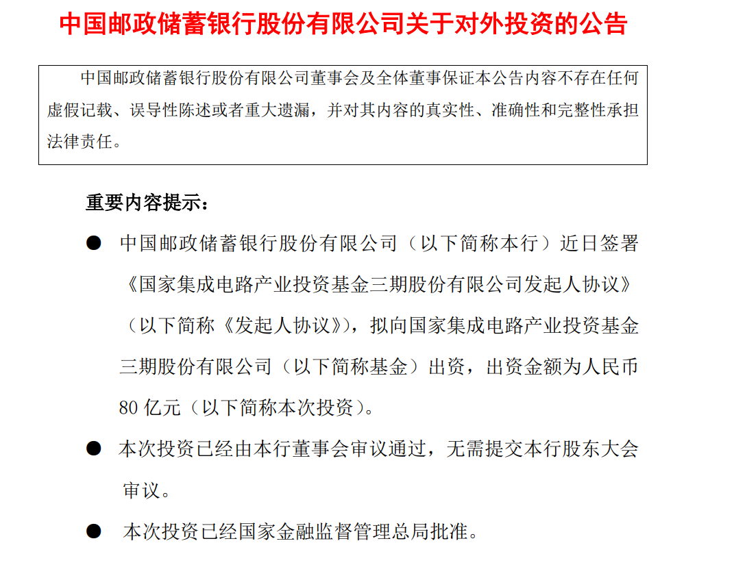 工商银行、农业银行、建设银行、交通银行、邮储银行表示,本次投资是该行结合国家对集成电路产业发展的重大决策、该行的发展战略及业务资源作出的重要布局,是该行服务实体经济、推动经济和社会可持续发展的战略选择,是该行践行大行担当的又一大举措,对于推动该行金融业务发展具有重要意义。