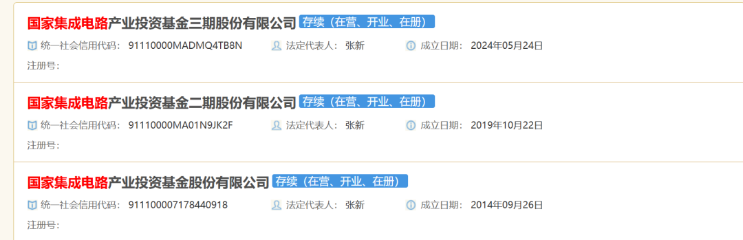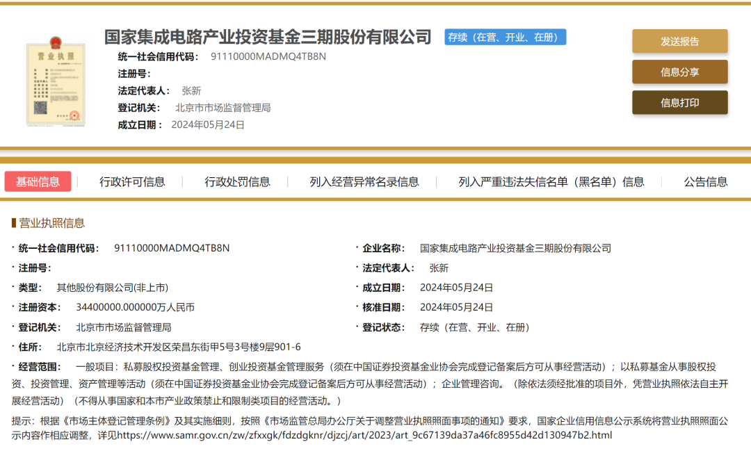 国家企业信用信息公示系统显示,大基金三期于5月24日在北京成立,法定代表人为张新,注册资本为3440亿元,经营范围为私募股权投资基金管理、创业投资基金管理服务,以私募基金从事股权投资、投资管理、资产管理等活动,企业管理咨询。