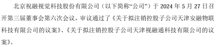 祝融科技拟注销控股子公司天津安融物联科技有限公司、天津视融通科技有限公司