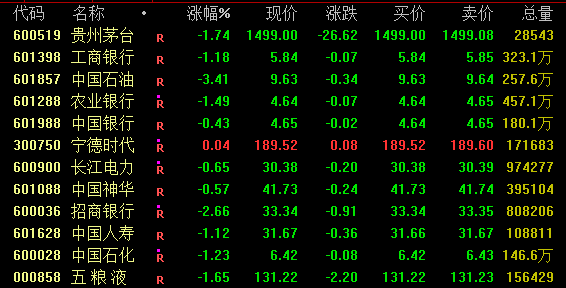 银行、酿酒、煤炭、石油、电力等权重板块今日集体回调,部分市值居前的个股悉数走低。截至收盘,中国石油跌3.4%,招商银行跌2.66%,贵州茅台(600519)跌1.74%,工商银行、农业银行、中国石化(600028)等均跌超1%。