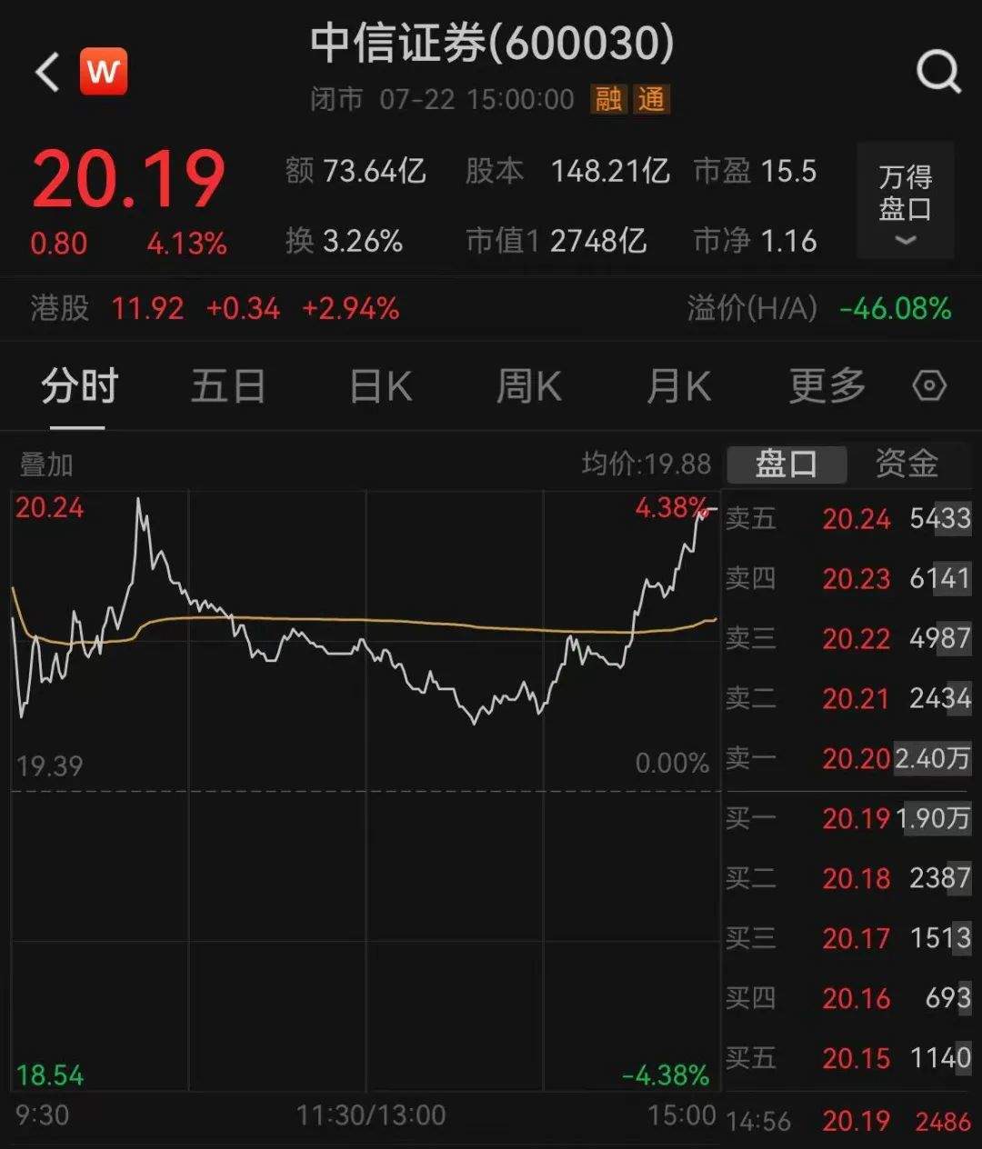 消息面上,近日,一条上海爷叔(网名:大A爱在深秋)唱多中信证券的视频火出圈。上海爷叔在视频中表示,中信证券将在7月22日―25日连拉三个涨停板,目标价将达700元/股,他认为中信证券将超越贵州茅台成为A股市值最大的股票。上海爷叔的力挺,随即让中信证券登上了各大股票平台的热榜。