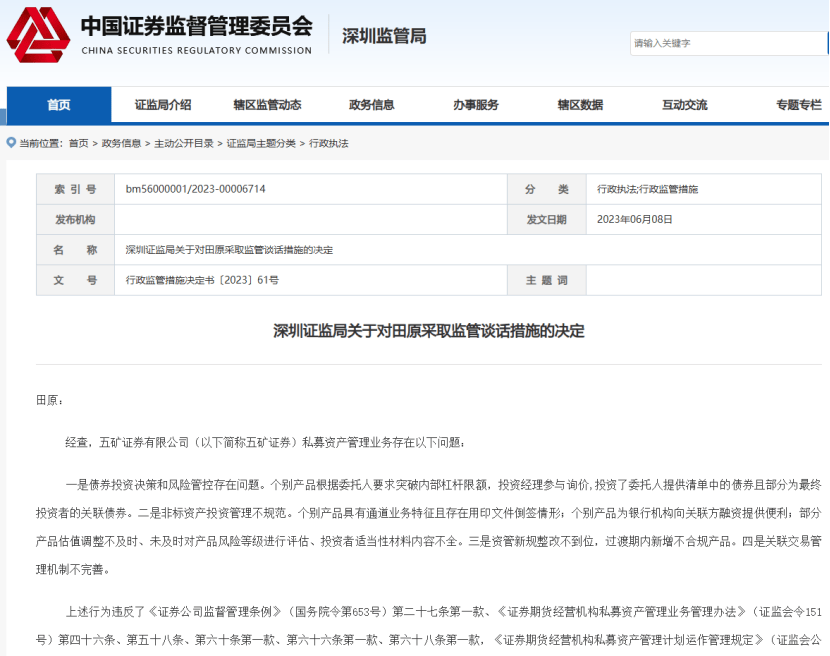 与此同时,深圳证监局官网确实在2023年6月披露过一则《关于对田原采取监管谈话措施的决定》的公告,公告披露,经查五矿证券私募资产管理业务存在以下问题:一是债券投资决策和风险管控存在问题。二是非标资产投资管理不规范。三是资管新规整改不到位,过渡期内新增不合规产品。四是关联交易管理机制不完善。田原作为五矿证券时任资产管理业务部门负责人,对上述违规行为负有管理责任,深圳证监局决定对其采取监管谈话的行政监管措施。