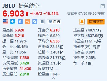 美股异动|捷蓝航空涨超16.4% Q2营收超预期 意外录得调整后每股收益