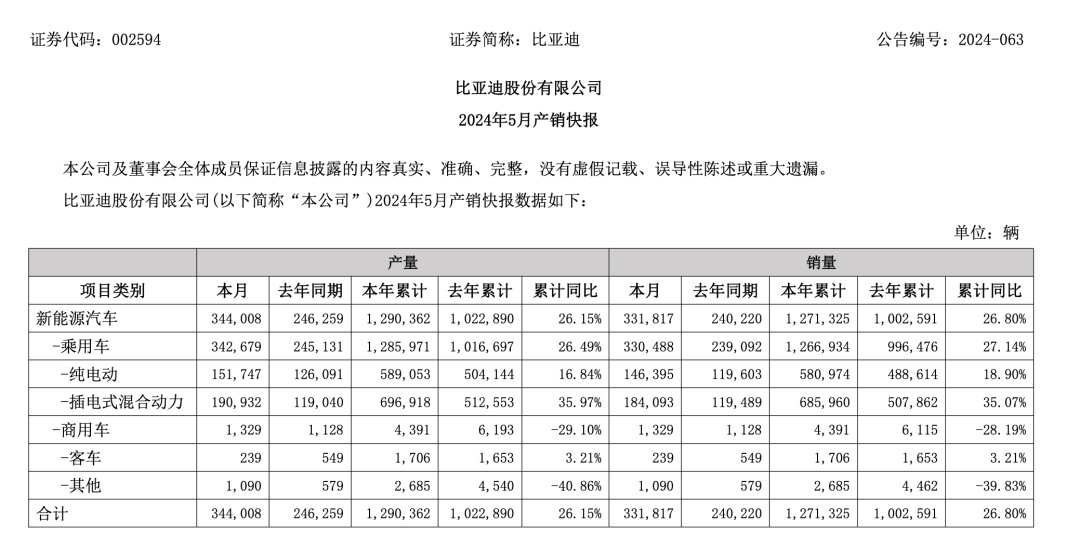 6月2日,比亚迪晚间发布5月产销快报,当月实现新能源汽车销量33.18万辆。其中,5月份比亚迪共销售纯电动车14.64万辆,同比增长22.40%;销售插电式混合动力车18.41万辆,同比增长54.07%。
