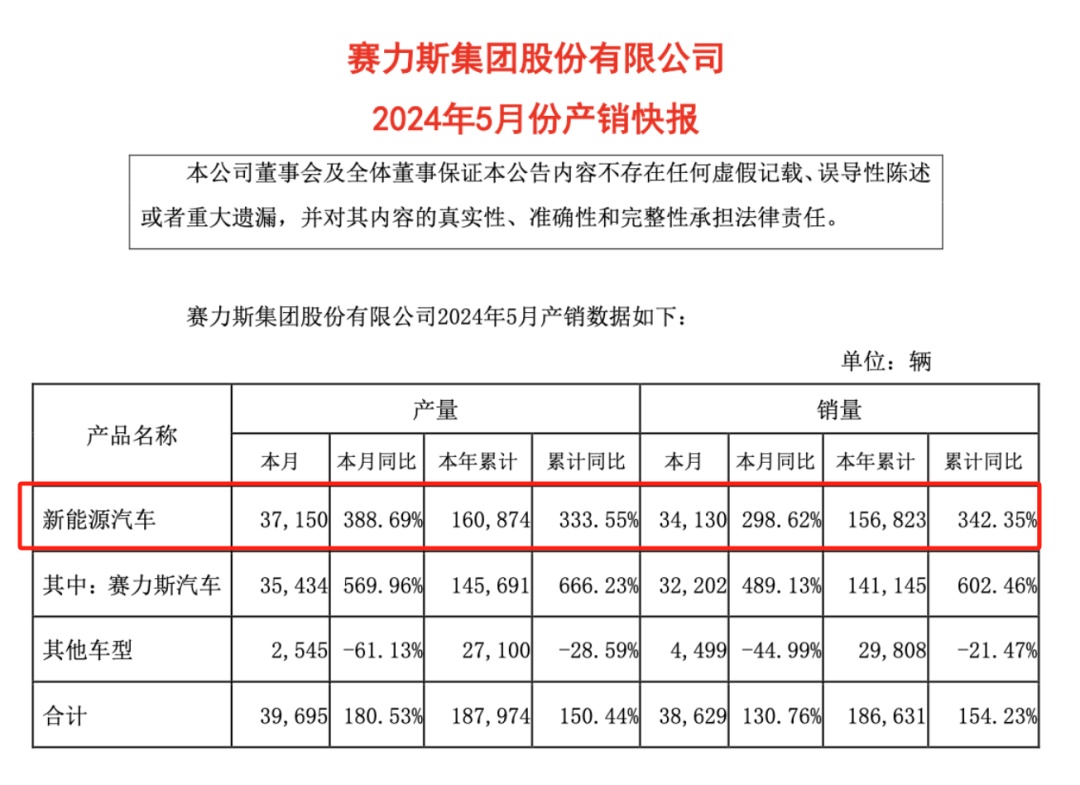 此外,赛力斯5月的销量增势也非常突出。赛力斯(601127)发布的5月产销快报显示,赛力斯5月销量达3.41万辆,同比增长298.62%;今年1―5月,赛力斯新能源汽车累计销量15.68万辆,同比增长342.35%。