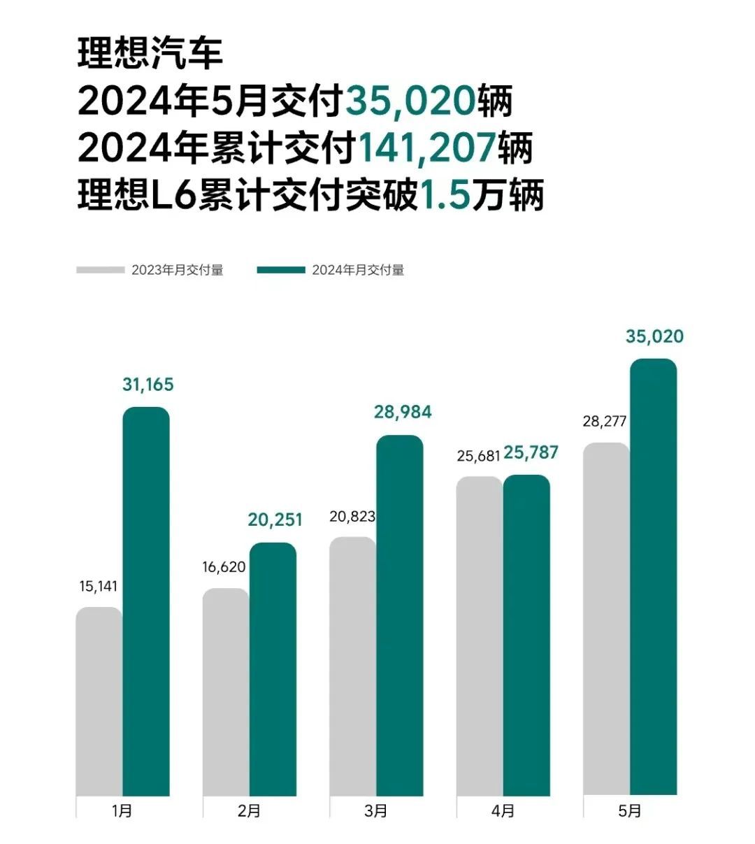 其中,理想汽车公布5月交付新车3.50万辆,同比增长23.8%。截至5月31日,理想汽车累计交付77.46万辆。