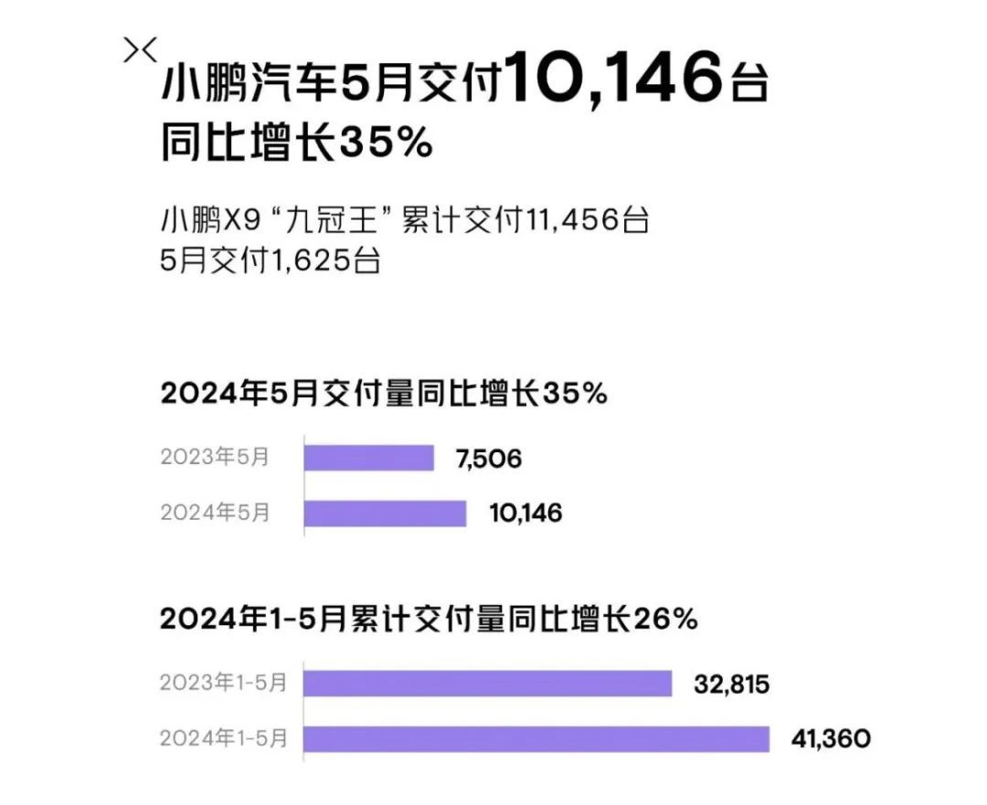 小鹏汽车公布最新交付成绩显示,2024年5月,小鹏汽车共交付新车1.01万台,同比增长35%,环比增长8%。2024年1―5月,小鹏汽车累计交付新车共4.14万台,同比增长26%。