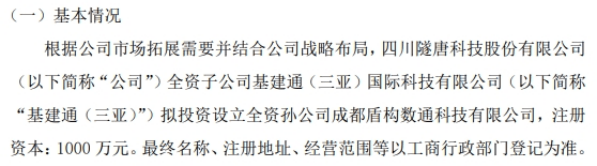 隧唐科技子公司拟投资1000万设立全资孙公司成都盾构数通科技有限公司