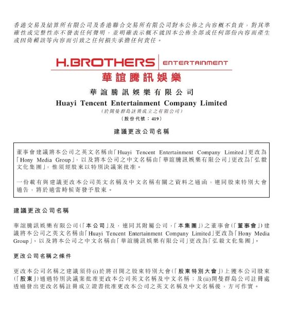 据公告显示,董事会建议公司中文名称由华谊腾讯娱乐有限公司变更为弘毅文化集团,公司英文名称由Huayi Tencent Entertainment Company Limited变更为Hony Media Group。同时,更改公司中文名称及英文名称本身将不会影响股东的任何权利或公司日常业务运作及其财务状况。