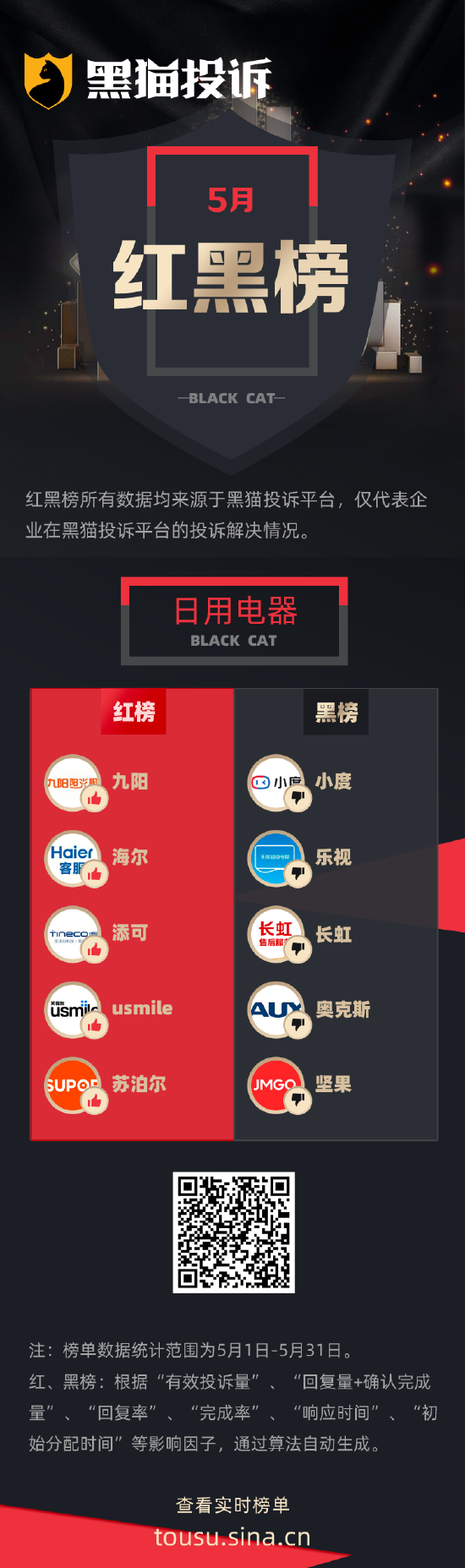 5月黑猫投诉日用电器领域红黑榜:坚果投影仪保修期内官方售后花式收费