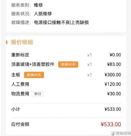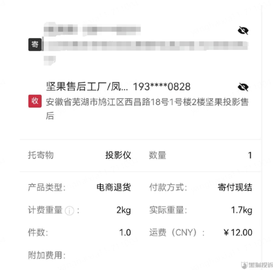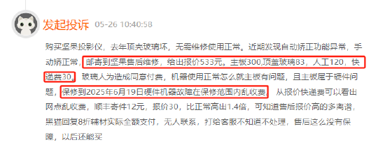 本月,有消费者来黑猫投诉反馈,称自己的坚果投影仪近期自动矫正功能异常,寄往售后维修被要求支付533元,包括主板、顶盖玻璃及人工、快递费用,仅快递费用就被要求支付30元。消费者指出,机器保修期截止到 2025年6月19日,主板故障应在保修范围内。消费者联系官方客服,无人受理。
