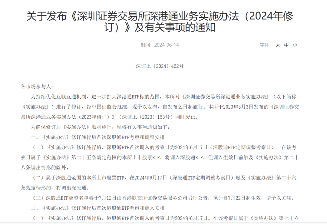 《实施办法》修订施行后,沪深港通ETF首次调入的考察日均为6月17日。在前述考察日符合规定条件的ETF将调入沪深港通ETF,但调入生效日前触及调出情形的除外。