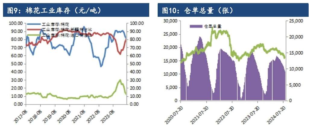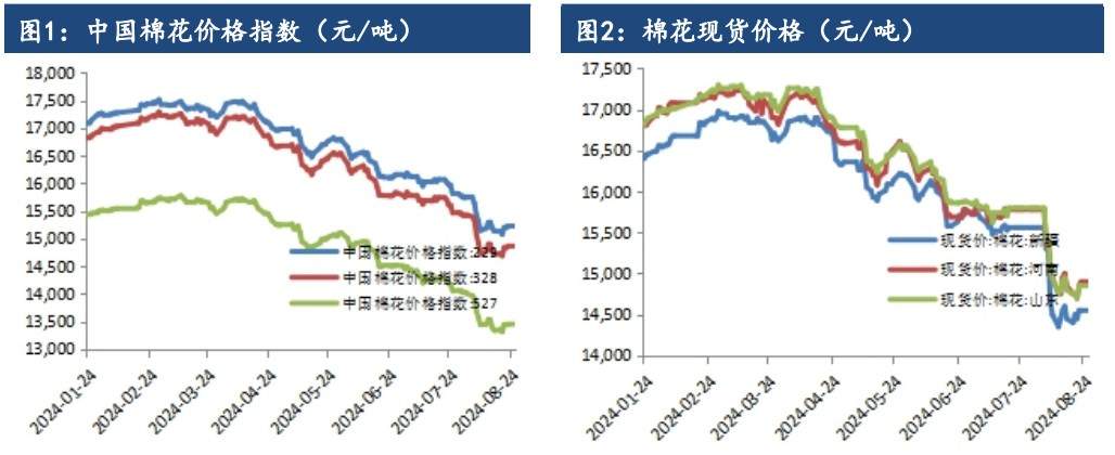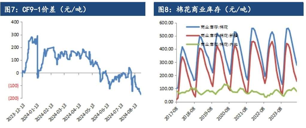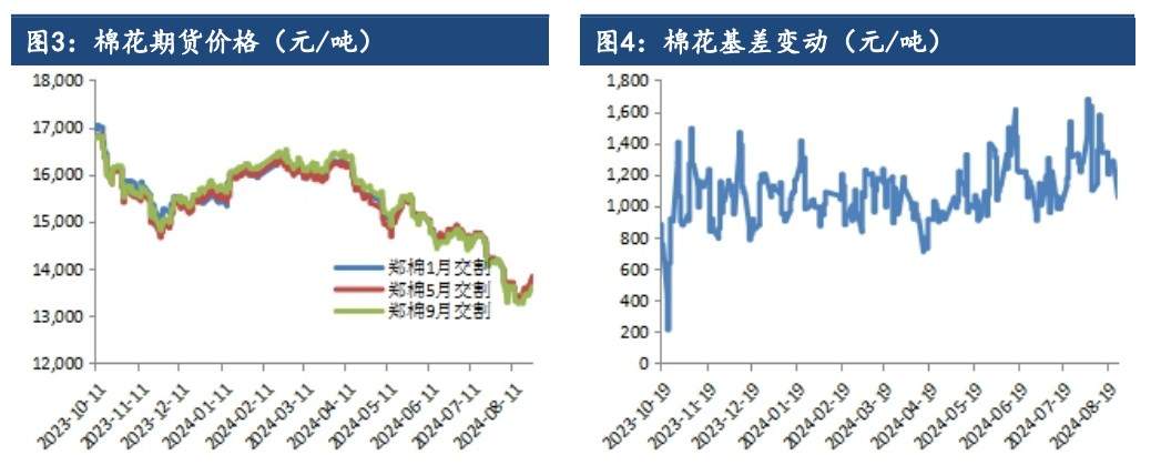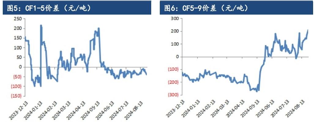 成持比上升,多空博弈增加。现货方面最新棉花价格指数328 级在14988元/吨,较上一交易日涨 13 元/吨。现货方面,2023/24 北疆机采3129/29B/杂3.5内主流较低基差报价在 CF09+1200 及以上,同品质CF01 合约主流基差报价较多也暂在 1200 及以上,南疆(非喀什、哈密)同品质多在CF09+1000 及以上,均为疆内自提。