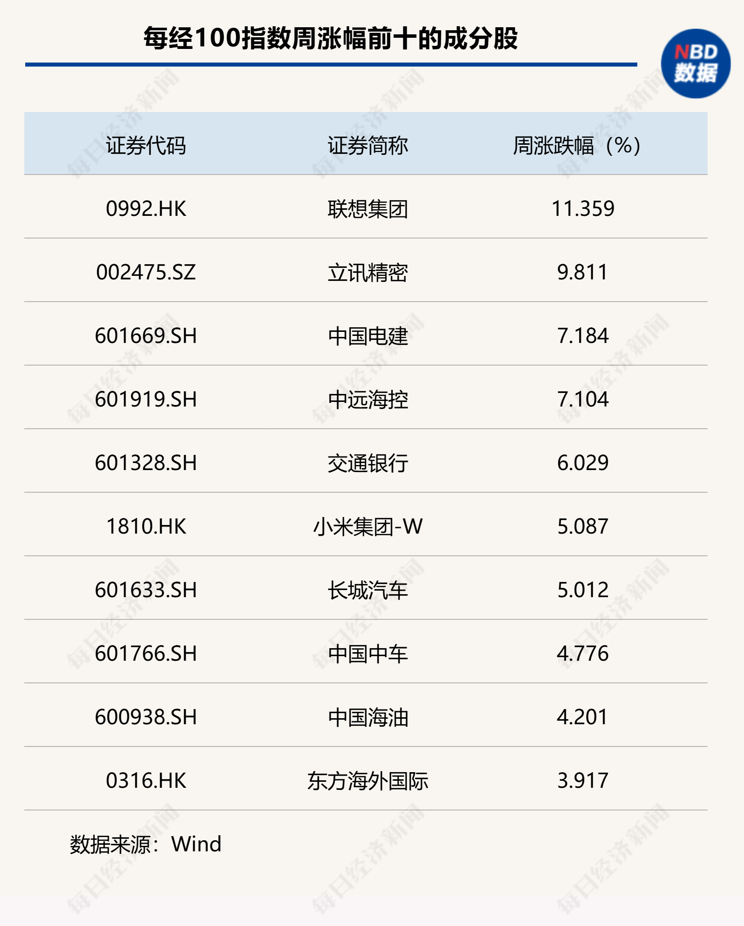 从本周每经品牌100指数成分股表现来看,港股科技类公司表现相对较强,小米集团和联想集团周涨幅均超过5%,其中,联想集团单周涨幅更是达到11.36%,而美团本周也同样收涨。