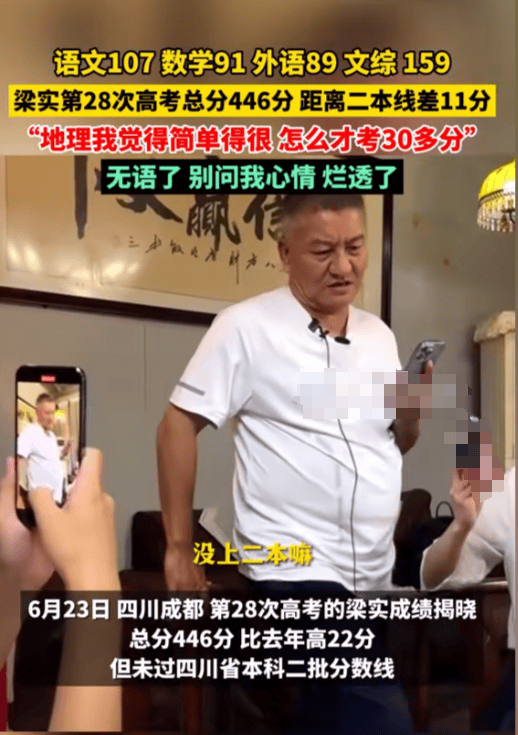 梁实第28次高考446分:未过二本线,是否继续参加明年高考,需再考虑