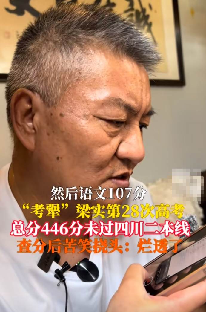 梁实,一位四川仁寿县的普通居民,自1983年起便开始了他漫长的高考之路。2023年,他以424分的成绩结束了第27次高考,尽管成绩较前有所提升,但仍未达到本科录取线。今年,他再次挑战高考,带着一丝希望和更多的压力,于6月8日完成了他的第28次高考。考试结束后,梁实面对镜头,表情凝重,坦言感觉情况不佳,担忧历史重演。