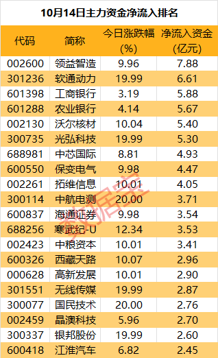 据证券时报・数据宝统计,10月14日,沪深两市主力资金净流出47.82亿元,其中创业板净流出6.29亿元,沪深300成份股净流出35.08亿元。