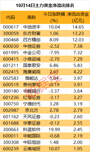 中油资本主力资金净流出14.65亿元,居首。东方财富(300059)主力资金净流出13.23亿元,居次席。还有四方精创(300468)、中信证券(600030)和中金公司等主力资金净流出金额居前。