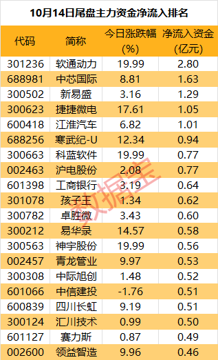 从个股来看,5股尾盘主力资金净流入均超1亿元,其中2股净流入金额均超1.5亿元。软通动力尾盘主力资金净流入2.8亿元,居首。中芯国际、新易盛(300502)和捷捷微电(300623)等尾盘主力资金净流入金额居前。