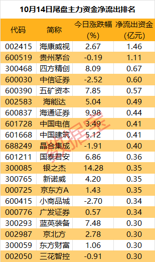 5股尾盘遭主力资金净卖出均超0.5亿元,其中2股尾盘净流出均超1亿元。海康威视(002415)尾盘主力资金净流出1.46亿元,居首位。此外,还有贵州茅台(600519)、四方精创和中信证券等尾盘主力资金净流出金额居前。