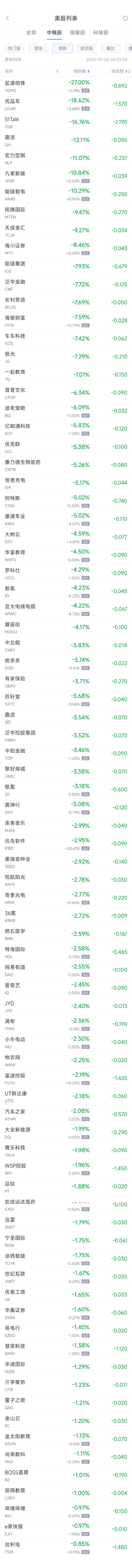 下跌股当中(按市值降序排列),台积电跌0.78%,京东跌0.19%,百度跌0.31%,中通跌0.19%,富途控股跌2.19%,满帮跌2.30%,BOSS直聘跌1.01%,哔哩哔哩跌0.97%,名创优品跌0.52%,WSP控股跌1.99%,极氪跌3.50%,爱奇艺跌2.45%,汽车之家跌1.95%,360数科跌0.15%,慧荣科技跌1.38%,雾芯科技跌0.27%。