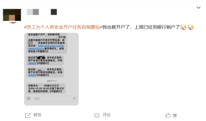 “员工为个人养老金开户任务自掏腰包”登上热搜 有网友表示曾遭遇银行员工推销个人养老金开户