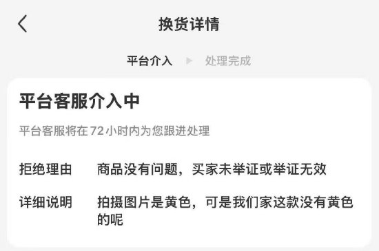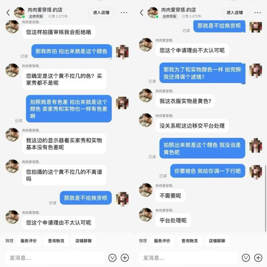 但是商家拒绝换货申请,沟通中,商家称衣服基本没有色差,不认可小林的申请理由,并将她拉黑。据小林反映,商家态度蛮横无理。因此,她申请了平台介入,但是平台也一直没有处理进展。