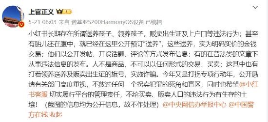 2024年5月21日,博主“上官正义”发文称,小红书长期存在所谓送养孩子、领养孩子,贩卖出生证及上户口等违法行为。对此,小红书官方发布治理公告称,平台核查发现,部分笔记下方存在评论违规情况,已对相关评论做下架处置,平台将持续清理站内违规内容。目前平台已将举报信息移交相关部门。
