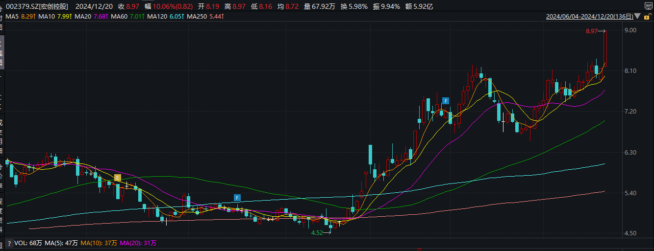 需要指出的是,宏拓实业曾于一年前引入中信金融资产(原“中国华融”)、中国东方等8名战略投资者。此外,宏创控股停牌前夕股价涨停,出现抢跑现象,引发投资者关于内幕信息泄露的热议。截至12月20日收盘,报8.97元/股,市值约102亿元。
