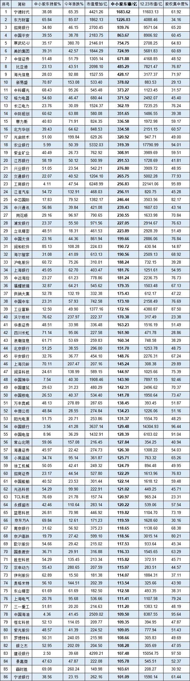截止12月23日,宁德时代今年股价涨幅65%,市值大涨4421亿元,中小股东赚1684亿元;东方财富股价涨幅85%,今年市值大涨1862亿元,中小股东赚1226亿元;招商银行股价涨幅46%,市值增加2700亿元,中小股东赚940亿元。