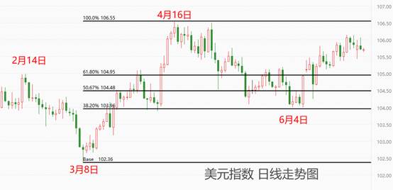 3月8日至4月16日,美元指数经历一轮流畅的上涨走势,最高价触及106.52点,创出年内新高。4月16日之后,随着降息预期增强,美元指数进入回调状态。在美联储多位官员持续发表鹰派讲话,叠加美国的CPI数据和非农数据表现靓丽,美元指数受提振并在6月4日寻得有效支撑,当日最低点103.99点。该点位符合0.618的黄金分割强阻力的要求,预示后期反弹会比较顺利。截至目前,美元指数仍处于6月4日以来的上涨波段。今日晚间的ADP数据会对美元指数的走势形成影响,如果公布值符合预期,意味着劳动力市场表现平稳,美联储降息预期受抑制,美元指数受提振。
