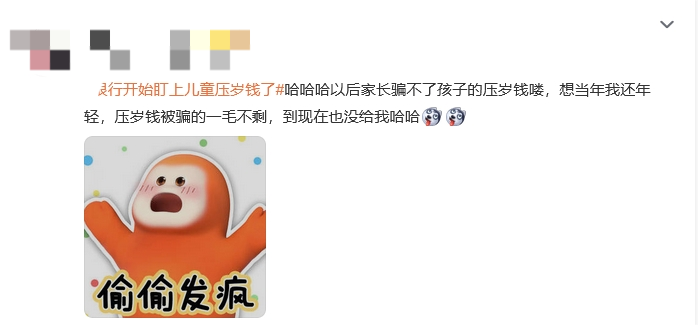 对此,有网友回忆童年经历评论表示:“以后家长骗不了孩子的压岁钱喽,想当年我还年轻,压岁钱被骗的一毛不剩,到现在也没给我哈哈。”
