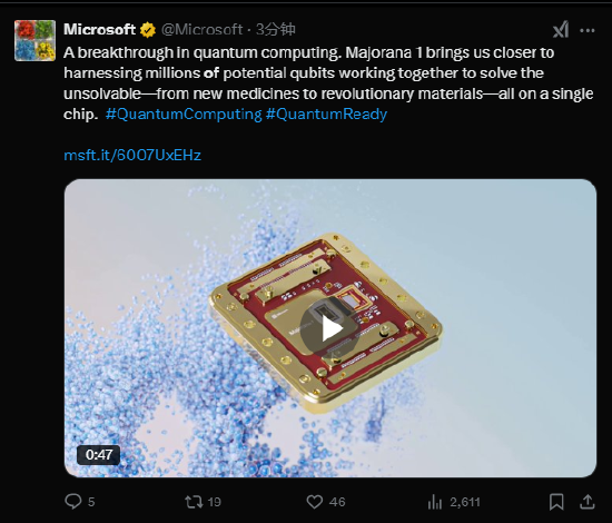 微软推出了采用全新拓扑核心架构的量子芯片Majorana 1。