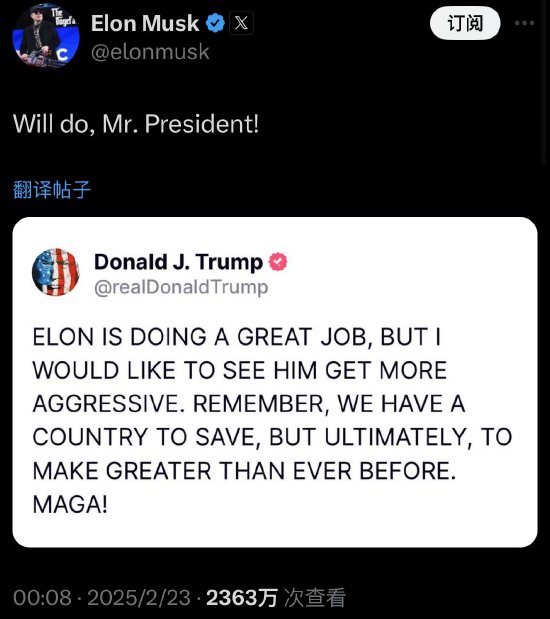 特朗普鞭策马斯克“希望他更加积极进取” 马斯克:我会的总统先生
