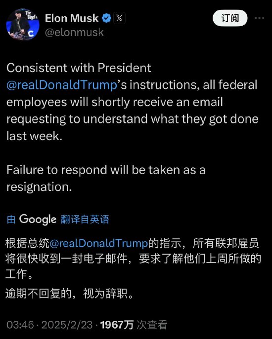 随后,他发文表示,“根据总统特朗普的指示,所有联邦雇员将很快收到一封电子邮件,要求解释他们上周所做的工作。逾期不回复的,视为辞职。”